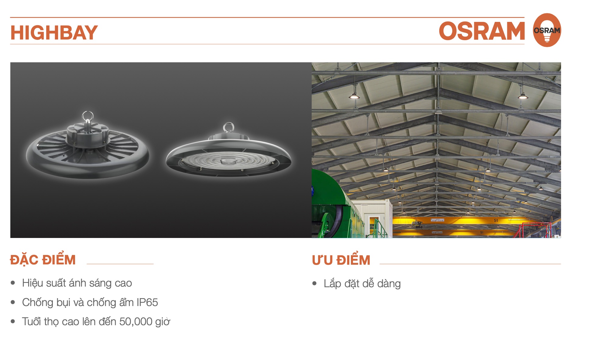 - Đèn Highbay Osram có hiệu suất lên đến 130-160 lm/W, giúp chiếu sáng rộng và đều cho các khu vực lớn, tiết kiệm số lượng đèn cần lắp.